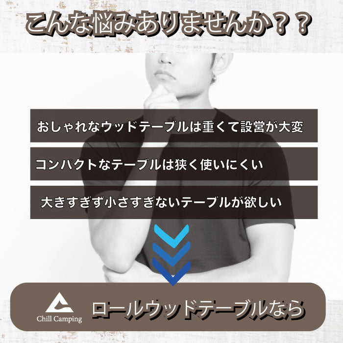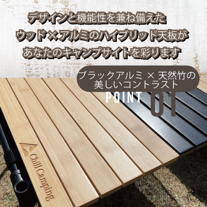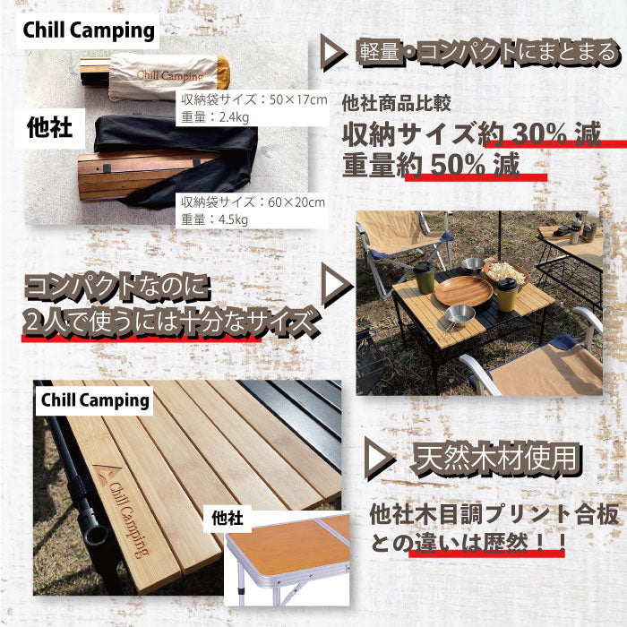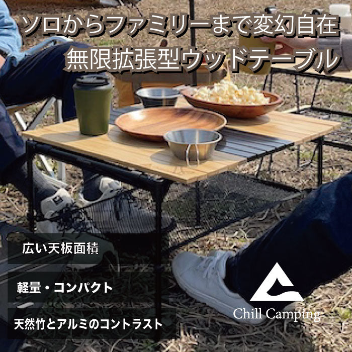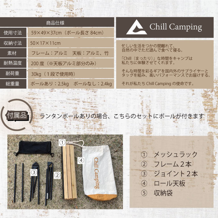 アルミと天然竹のコントラスト。機能性を備えながらも、Chill Campingオリジナルのシンプルで使いやすいデザイン。収納袋は帆布素材使用。肩がけできてコンパクト。